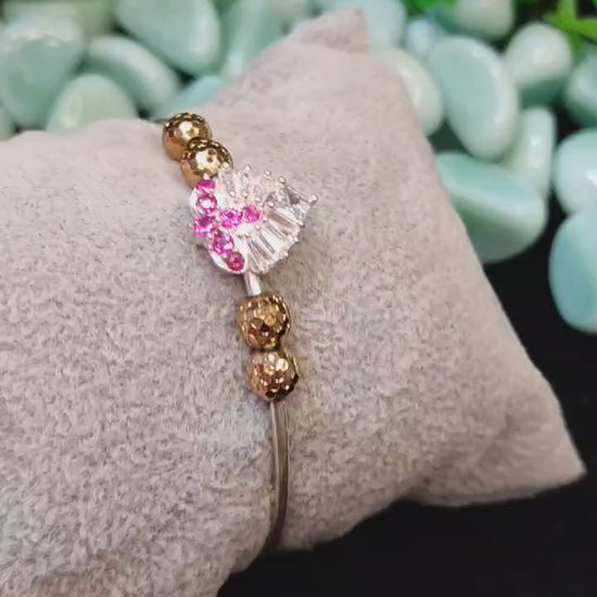 Blending 70% pure silver with high-quality materials, this design is a testament to our commitment to style and durability. This unique bracelet features shimmering gold beads and a stunning pink stone cluster centerpiece, creating a chic and modern look. The free-size design ensures a comfortable fit, making it perfect for any occasion, from casual outings to formal events.