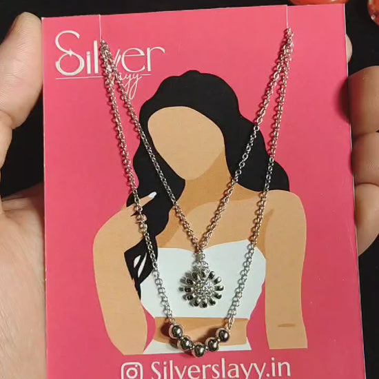 Make a bold statement with this trendy 925 sterling silver layered necklace, featuring two distinct pendants. The 18-inch silver chain is adorned with a beautifully crafted floral-inspired pendant and a sleek row of silver beads, offering a modern and chic layered look.