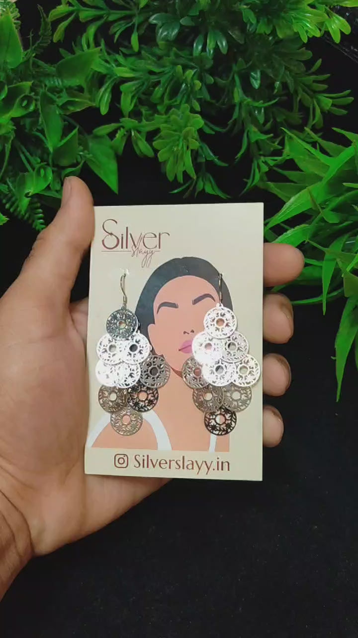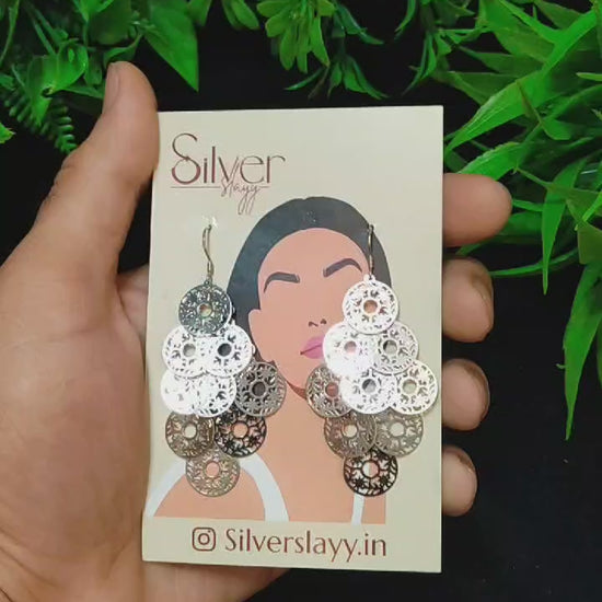 Make a bold statement with these layered filigree disc earrings in silver, perfect for adding a touch of bohemian chic to any outfit. Featuring intricate cut-out designs on multiple cascading discs, these earrings bring a beautiful sense of movement and style. Lightweight and eye-catching, they’re ideal for both casual days and special occasions. Crafted by SilverSlayy, these earrings are a must-have for those who love unique and artistic accessories.