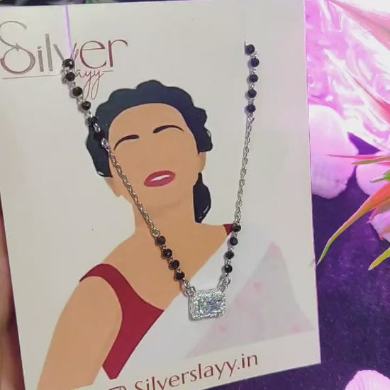 Elevate your style with this square pendant silver Mangal Sutra by SilverSlayy. Featuring a dazzling cubic zirconia centerpiece and a sleek black-beaded chain, this necklace offers an adjustable length of 16 to 18 inches for a perfect fit. A blend of tradition and contemporary elegance, this piece is ideal for everyday wear or special occasions. Shop now and make a timeless addition to your jewelry collection!