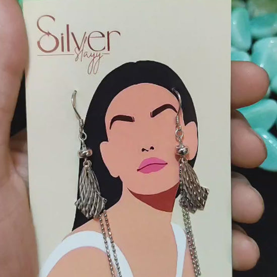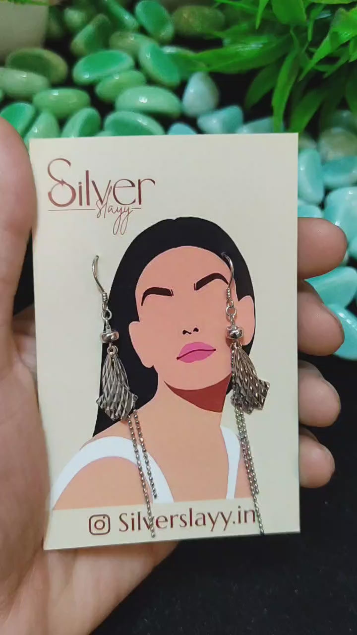 Stand out with these elegant silver dangle earrings featuring a distinctive textured geometric design and dual chain drop. Made from authentic 925 silver and sealed for quality assurance, these earrings bring a blend of modern sophistication and artistic charm. The intricate texture on the geometric pendant adds depth, while the delicate chain accents enhance their graceful, elongated look. Perfect for both casual and formal occasions, these lightweight earrings are designed by SilverSlayy for those who appreciate unique yet versatile accessories. Treat yourself or gift someone special with this chic statement piece!