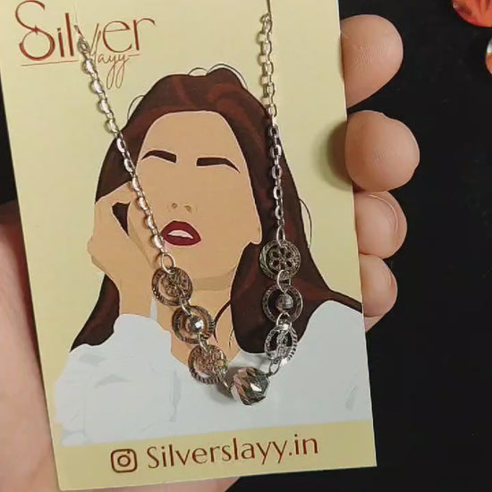 The detailed silver accents and striking geometric pendant add a touch of sophistication to casual and formal outfits alike, perfect for those who love to stand out with distinctive jewelry.